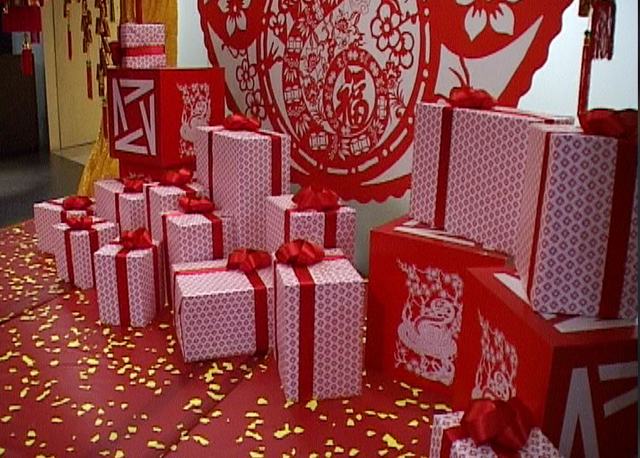 万科新年气氛营造方案-地产总部大堂灯笼树下礼物堆放效果